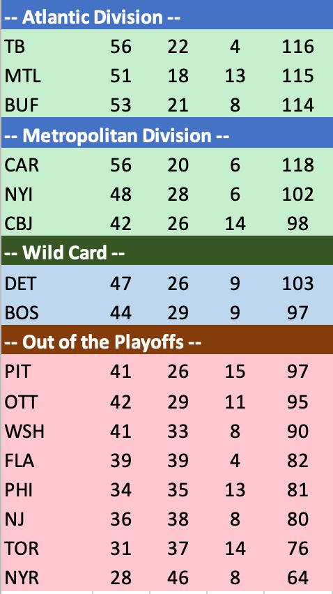 Ottawa Projected Finish: Trending to finish tenth in the conference, 2 points behind Pitt, who are only 1 point behind Boston for the Final Spot...