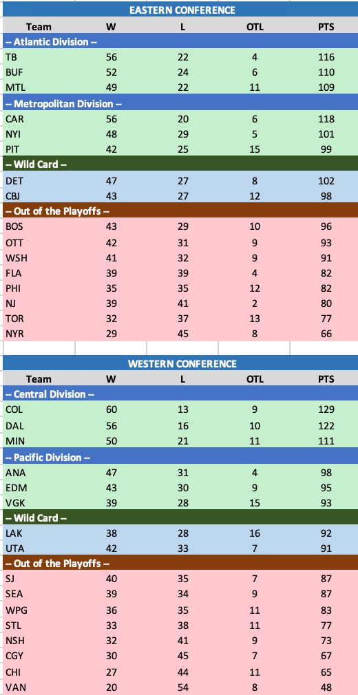 Last night's Penguin's impressive win, and Boston's OTL has pushed the Penguins into the playoffs all the way up top the the third spot, knocking Columbus back to the second Wildcard, while Detroit projects into the first Wildcard spot.